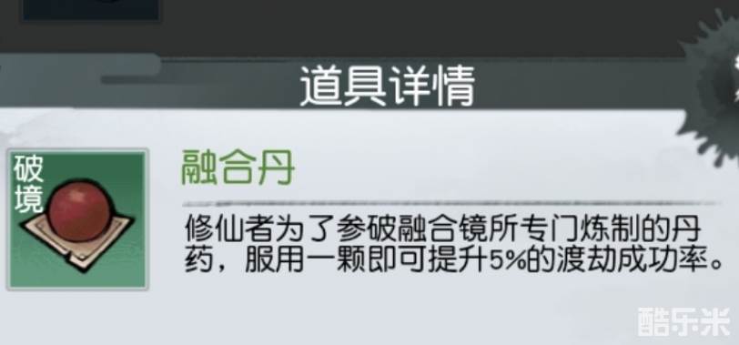 融合丹是游戏中的常见材料,虽然常见,但是确实对玩家十分重要的,因为每一颗融合丹都可以为玩家提供5%的渡劫成功率,帮助玩家渡劫成功,而渡劫成功之后,玩家的战力会得到很大提高,所以融合丹对于玩家还是很重要的!