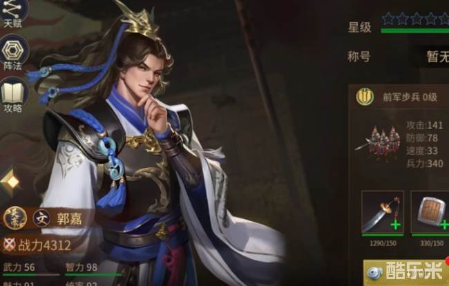 郭嘉属于英豪型武将,在本次测试期间因为没有开放更高等级的角色,所以英豪就已经是最顶级的一批,在属性方面非常强势。即使后期开放了传奇型武将,相信依然能够成为队伍中的主流,所以在各项属性方面,郭嘉完全没有问题。进入战斗后,前军步兵,后军方士,自身天赋世之骑士,使用奇谋技能时伤害提高30%。一旦受到敌方文官或武官攻击,将减免25%受到的伤害。还有一个效果是每提升一级滚木技能等级,则技能奇谋伤害获得提升后,军方士士兵基础攻击力提升。