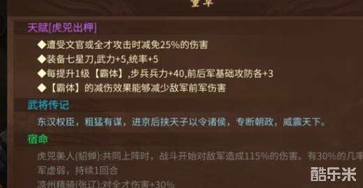 从这些效果可以看出,董卓天赋带来的提升还是非常全面的,既有伤害减免又有属性加成,还有技能提升效果,更难能可贵的是为七星刀独立设置了一条属性,这在很多武将中都不曾出现。从这些效果中我们可以得出结论,董卓是一名综合属性偏高的武将,而且在远战回合可以减免受到敌军伤害,在防御方面拥有极高坦度,是一名很强的肉盾型选手。在目前很多活动中,肉盾型角色都有很好的发挥,相信董卓也不会例外。