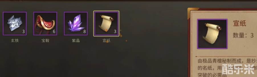 宣纸就是制作宝物的一种重要工具,基本上所有的宝物都是需要用到宣纸的,宝物的品质越高,需要用到宣纸的数量就会越多,后期我们再给宝物进行升级突破的时候,也是需要用到宣纸的。