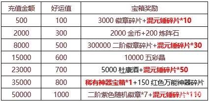 【活动内容】活动期间可通过充值金币获得好运值,积累好运值即可打开宝箱奖励,闪耀称号,全新神器,绝对超值的提升战力资源,尽在特惠好礼。