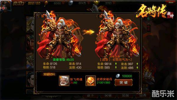 《超神名将传》中的每位武将都有自己的天赋属性,当玩家实现武将突破后,就能激活这些天赋,从来使战力得到大幅度提升。比如张飞在第一次突破后,会获得力战的天赋,武将技能攻击力增加700,突破越多,获得属性越强!不过武将在突破时,需要提供武将突破丹以及武将魂魄,另外还需要一定数量的银两才行。