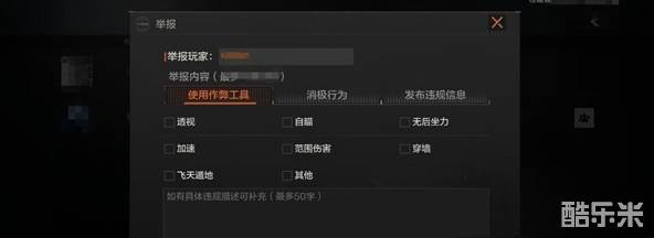 2、然后在举报内容中勾选【使用作弊工具】,再在下方将详情用文字的形式进行描述,然后点击【举报】即可。
