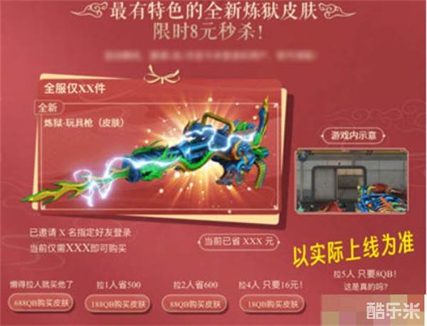 4:同时还有八元秒杀的活动,炼狱玩具枪皮肤邀请五人就可以用八块的价格拿下这个皮肤,但是邀请人的任务还是比较难做的。