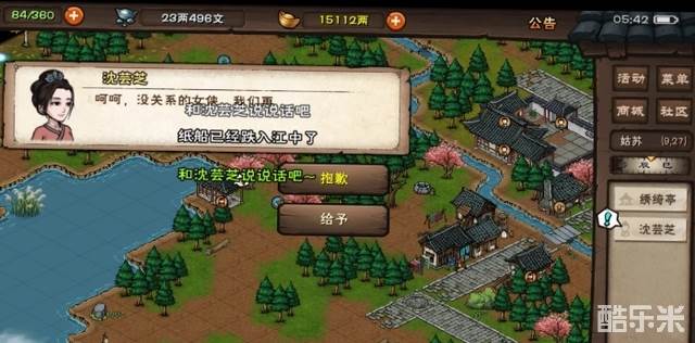 前往姑苏(9,27)绣绮亭,点击【给予】将纸船交给沈云芝。