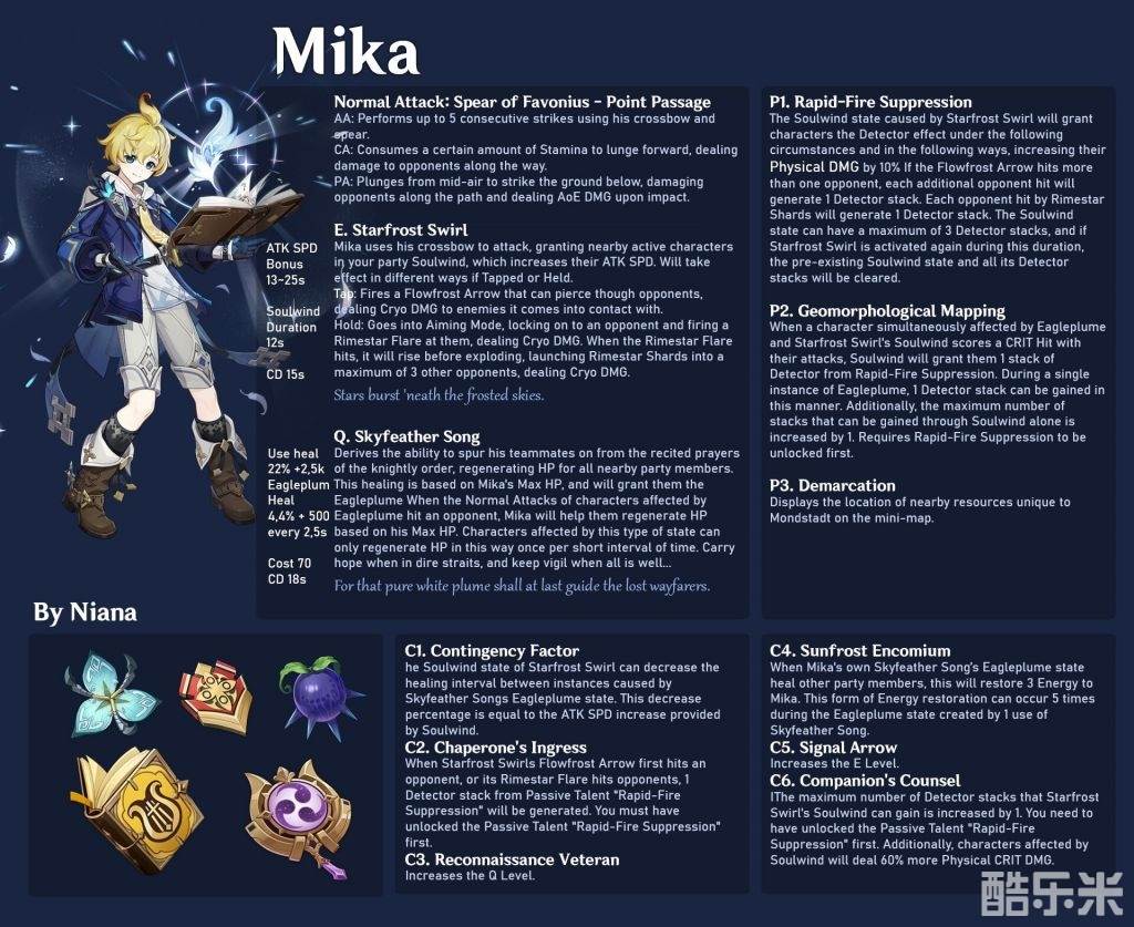 米卡天赋材料需要苍砾蕊羽、愚人众徽记钩钩果、诗议、无心的渊镜,想要抽取米卡的玩家可以提前搜集。
