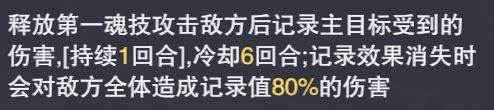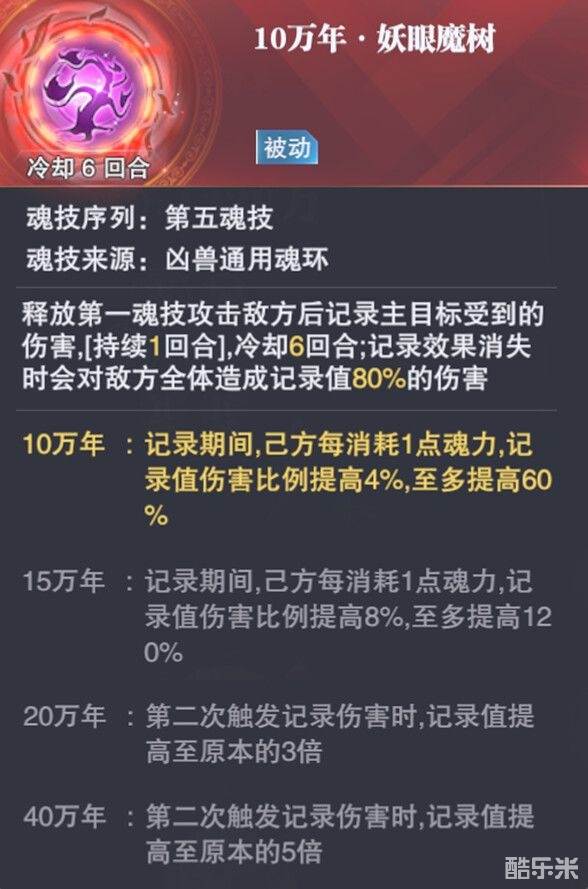 10万年:记录期间,我方每消耗1点魂力,可额外增伤4%,最高60%,相加原伤害比例相当于最高提升至140%的额外伤害15万年:记录期间,我方每消耗1点魂力,可额外增伤9%,最高120%,相加原伤害比例相当于最高提升至200%的额外伤害20万年:第二次触发记录值伤害时,伤害提升为原来的3倍,相当于最高提升到600%的额外伤害40万年:第二次触发记录值伤害时,伤害提升为原来的5倍,相当于最高提升到1000%的额外伤害