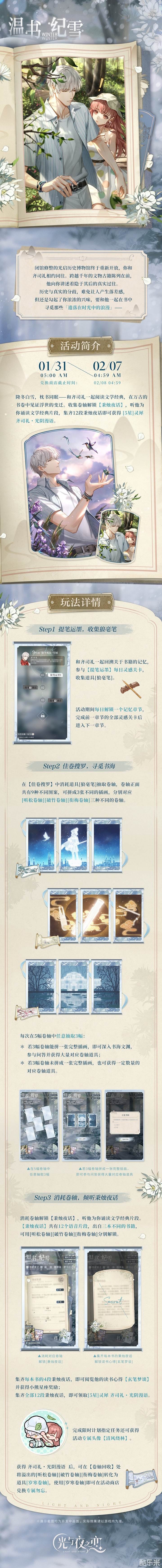 3、活动概要:隆冬白雪,枕书同眠——和齐司礼一起阅读文学经典,在万古的书卷中见证浮世的变迁。收集卷轴解锁【秉烛夜话】,听他为你诵读文学经典片段,集齐12段秉烛夜话即可获得[5星]灵犀 齐司礼・光阴漫语。