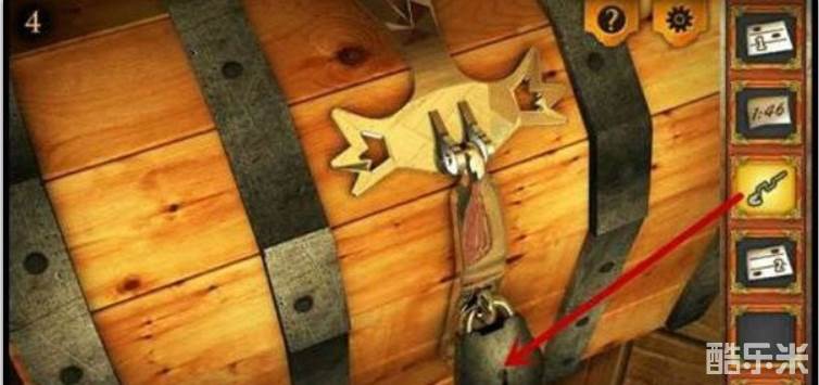 6、点击最左边的箱子,用别针打开锁。打开后根据拿到的两张纸上的提示来调整机关,第一个和第四个都在最上面、第二个在中间、第三个在最下面。