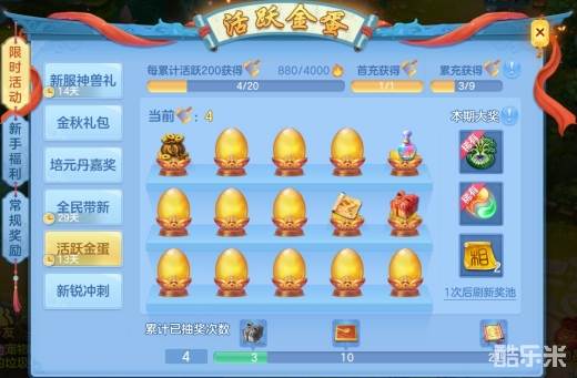 活动期间通过获取活跃度或达到一定充值条件,可以获得敲蛋次数,更有机会获得源生之灵、高级坐骑元神等大奖。