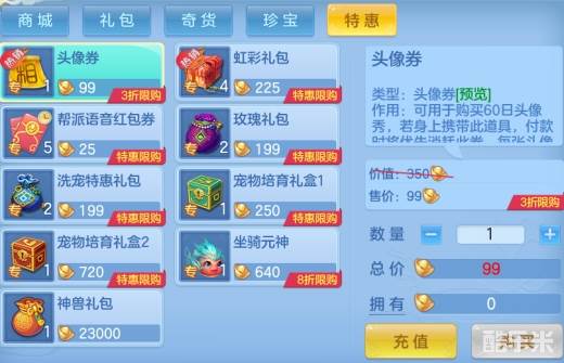 新服开启的前半个月开放特惠商城,其中出售包含头像劵、洗宠特惠礼包、坐骑元神等多种超值限量道具!