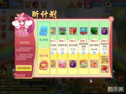 30级开启昕计划后,只要达成指定目标便可领取奖励,解锁进阶版后还可领取对应目标的进阶大奖。