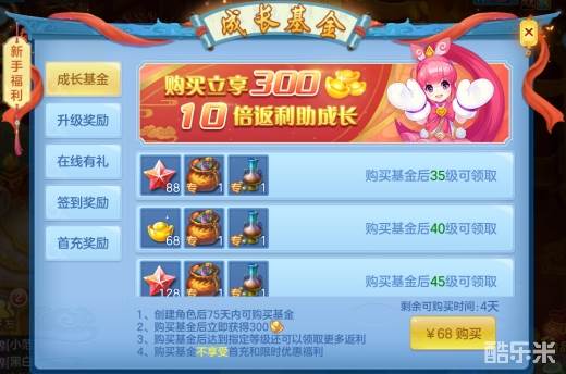68元可购买,购买后立刻获得等价值金币,之后只需达到指定等级还可领取包含金币在内的各种返利,总价值高达10倍!