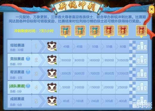 开服前15天,在经验、成就、竞技、帮派、战队5条赛道上达到一定条件即可领取奖励,冲刺结束时每条赛道的前10名还可领取包含专有称谓在内的大奖!