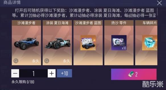 『沙滩漫步者秘宝』:开启秘宝后,可随机获得:沙滩漫步者、涂装-夏日海滩、车辆蓝图等稀有奖励,累计20抽必得永久车辆-沙滩漫步者,累计40抽必得涂装-夏日海滩,同时每60抽必得一张蓝图奖励!