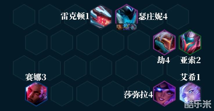 阵容组成:劫、瑟庄妮、雷克顿、艾希、赛娜、莎弥拉、亚索