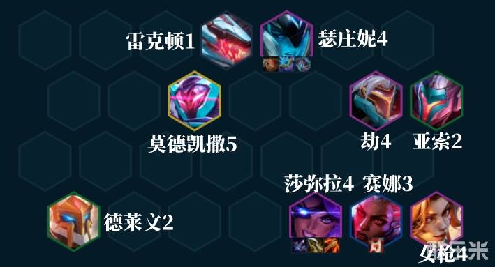 阵容组成:莫德凯撒、女枪、莎弥拉、德莱文、亚索、雷克顿、瑟庄妮、赛娜、劫