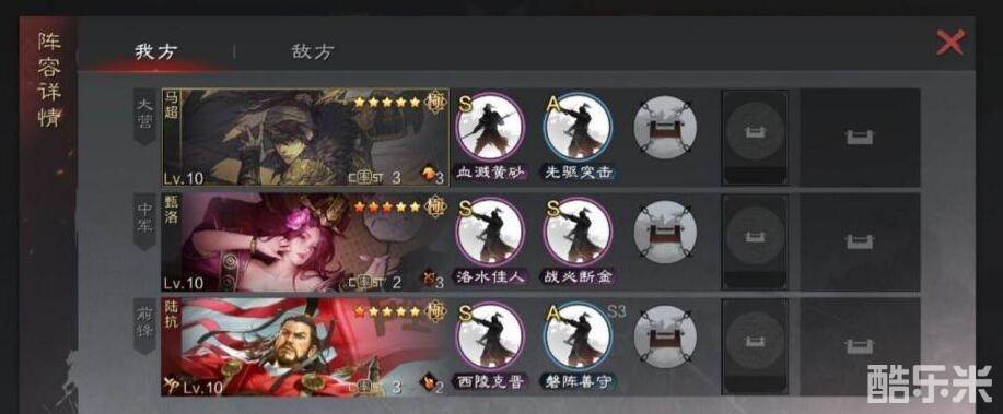 2. 马超陆抗甄洛相对比较稳定,并且有一定的回复能力,陆抗自带战法【西陵克晋】对比【奇兵拒北】的触发率更高。
