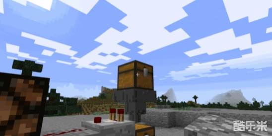 之后在箱子左侧放置一个普通方块,并放好红石火把,连接红石粉。