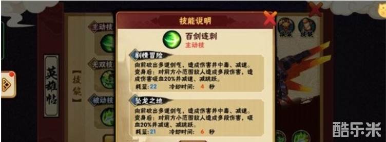一技能,百剑连刺,变身前向前砍出多道剑气,造成伤害并中毒、减速。变身后:对前方小范围敌人造成多段伤害,吸血20%并减速、减跳跃。一技能前期抢线能力非常强,除了几个ss级别英雄,抢线基本上不怕其他英雄。并且附带减速,中毒效果,降低对方前期的一个发育机动性。