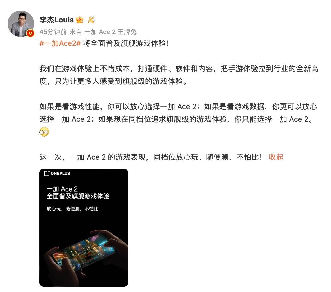 1月31日,一加宣布一加Ace 2将搭载独家定制的专业渲染芯片与独家自研的超帧超画引擎,带来全面超越原生游戏的极致体验,全面普及旗舰游戏体验。一加中国区总裁李杰表示,“我们在游戏体验上不惜成本,打通硬件、软件和内容,把手游体验拉到行业的全新高度,只为让更多人感受到旗舰级的游戏体验。一加Ace 2的游戏表现,同档位放心玩、随便测、不怕比!”