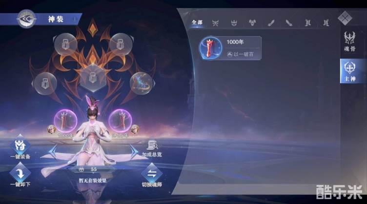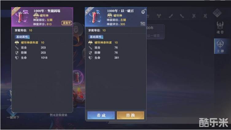 神装是可以培养的,低品质神装可以拿来给高品质神装提升年份,年份越高属性越多 对应神位亲和度也越高,亲和度高了还可以解锁神位天赋技能。