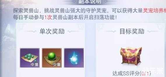 灵兽山为单人副本,在规定的时间内击败多波怪物,根据战斗时长进行评分来获得奖励的玩法,是玩家获得灵宠升级材料的主要来源