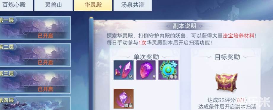 华灵殿为单人副本,在规定的时间内击败多波怪物,根据战斗时长进行评分来获得奖励的玩法,是玩家获得法宝升级材料的主要来源