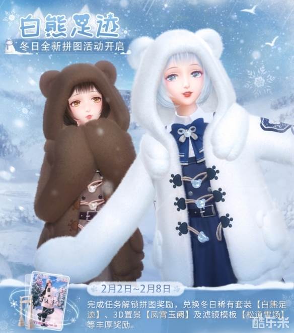 活动方式:活动期间,参与限时感应及限时累充等任务,收集「熊熊炸弹」,即可解锁对应拼图,兑换稀有套装【白熊足迹】、3D置景【凤霄玉阙】、滤镜模板【松道雪场】、粉钻及动作等丰厚奖励。