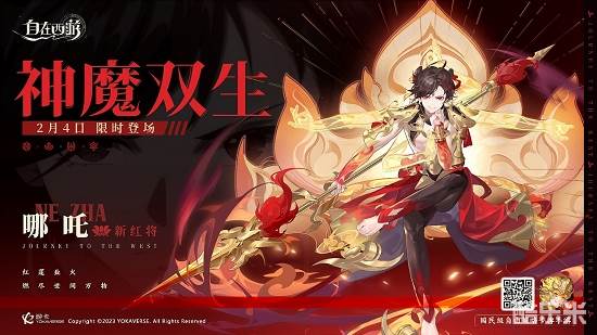 神魔双生之力,赤莲浴火降临。《自在西游》全新仙界红将——哪吒将于2月4日降临三界,开启限时召唤活动!全新剧情来袭,限时挑战活动开启,仙界伏魔大元帅哪吒将通过“跨阵营输出”和“无限重生”的强大能力带给各位玩家“搭配不设限,阵容才百变”的自由策略体验!