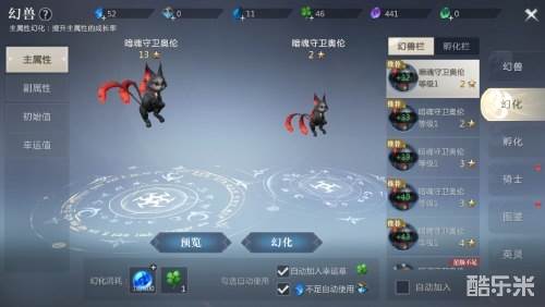 主属性幻化:主属性幻化直接影响幻兽主属性,可以使用奇异兽或同类幻兽作为副幻兽进行幻化,星级越高,使用的幻兽星级就越高。根据主幻兽属性,使用的副幻兽有一定的星级和等级条件,幻化时可以使用幸运草,将每次提升的主属性、主评分固定为最大值。