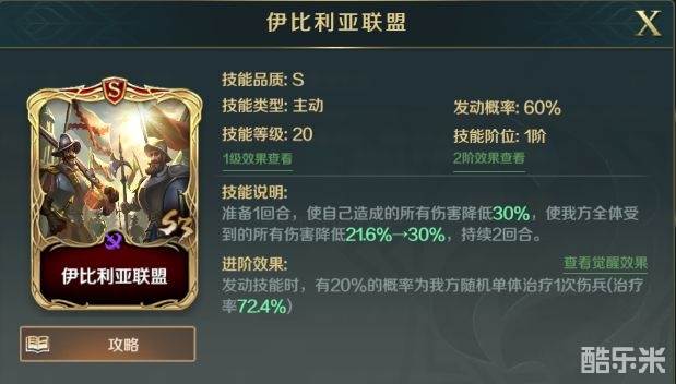 【伊比利亚联盟】是一个标准的防御技能,以降低自身造成的伤害为代价,为我方换取群体伤害减免,非常适合坦克英雄、辅助英雄使用,用以保护队伍中C位的安全。
