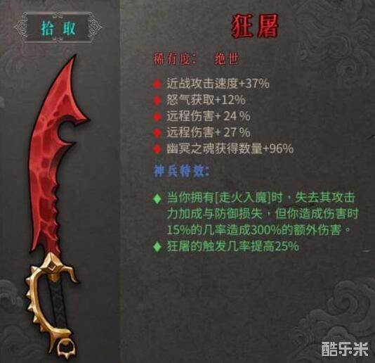 暖雪中有各种各样的神兵,每一种神兵都有不同的效果以及能力,有很多玩家对其中的绝世武器狂屠的效果不太了解,那么暖雪绝世武器狂屠的属性到底怎么样呢?下面小编为大家带来了狂屠相关的介绍,一起来看看暖雪绝世武器狂屠怎么样吧。