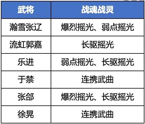 武将:瀚雪张辽-吕布护法、流虹郭嘉-张辽护法、乐进、于禁、专武张郃、专武徐晃