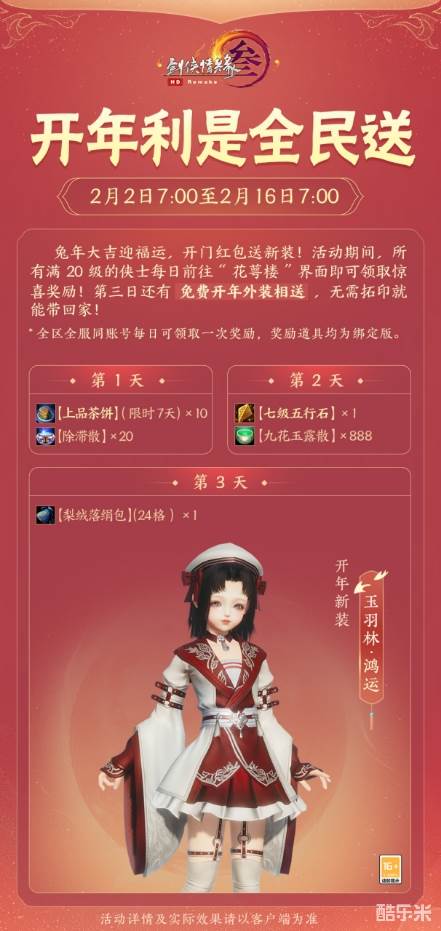 萌兔迎春来,春暖送福到,《剑网3》兔年开年利是今日全民可领,免费新装【玉羽林·鸿运】无需拓印即可拥有,还有【七级五行石】、【24格背包】、10个【上品茶饼】等惊喜好礼不容错过!暖意融融共度佳节,恭祝侠士们新的一年喜气满满,好事连连!