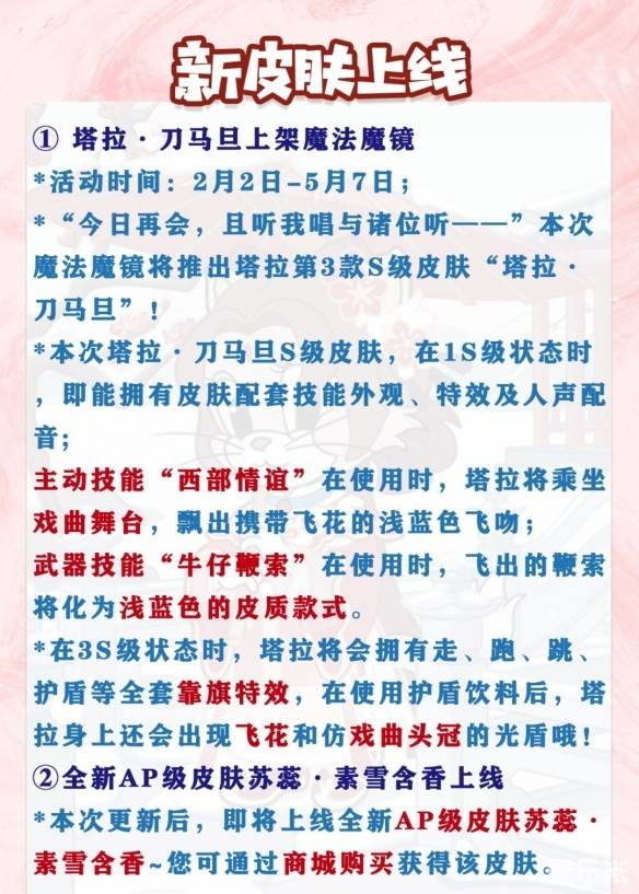 “今日再会,且听我唱与诸位听——”本次更新后,即将上线全新S级皮肤塔拉·刀马旦~您可通过“刀马旦魔法魔镜”获得该皮肤。