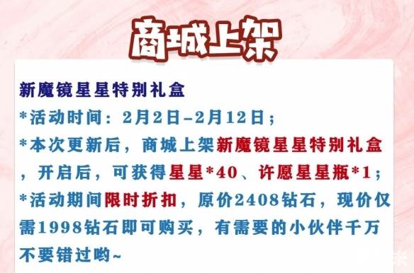 本次更新后,商城上架新魔镜星星特别礼盒,开启后,可获得星星*40、许愿星星瓶*1;