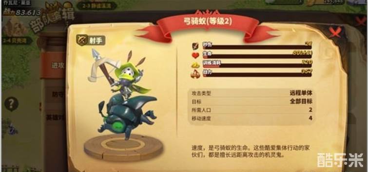 首先说一下探索地图时的对战模式,该模式下的对战大部分都是人机对战,因此在兵蚁的选择上适合听从系统的推荐,一般来讲前期都是推荐弓骑蚁和厚甲猛蚁。弓骑蚁的技能可以保证在推图阶段抗住前期伤害,好让后方的英雄有喘息和作战的机会。