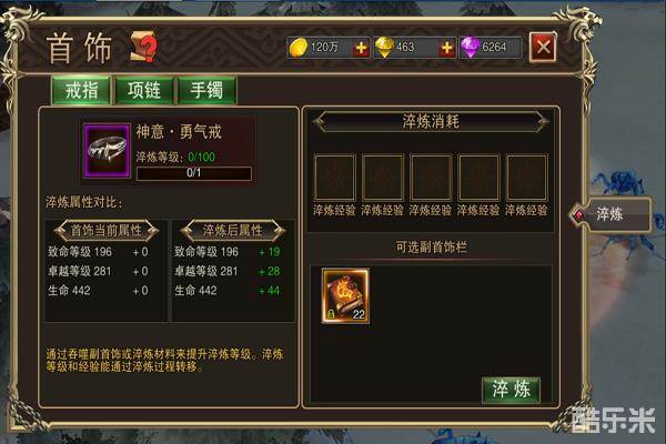 2.主首饰吞噬同样部位的副首饰或淬炼材料可以提升淬炼经验和淬炼等级.淬炼等级提升后可以提升淬炼属性
