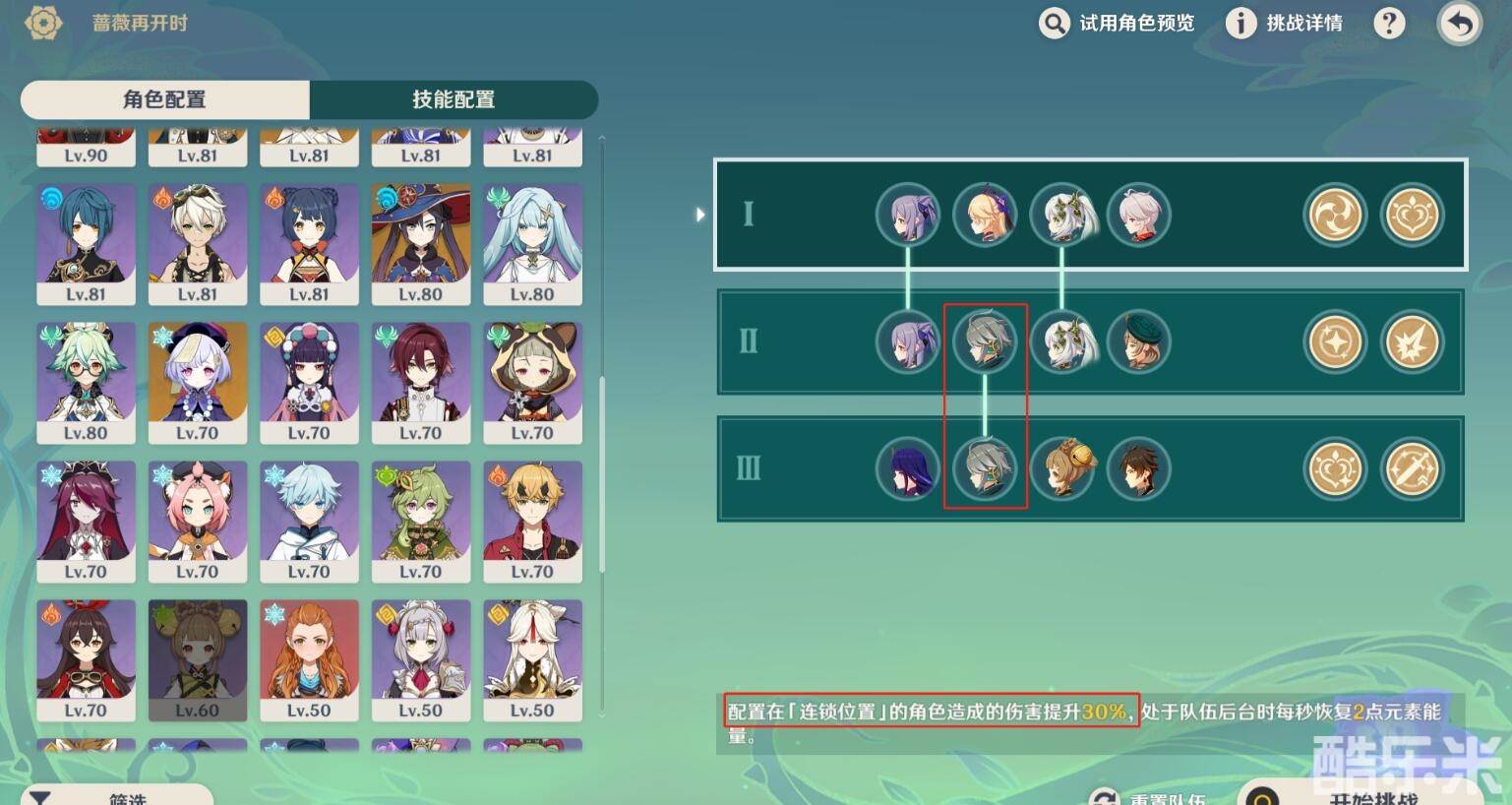 连锁位置的角色,造成的伤害能提高30%,所以这个位置,一般建议配置有输出能力的角色,比如主c,或者副c。如果挂元素角色少,也可以用来放挂元素的角色。