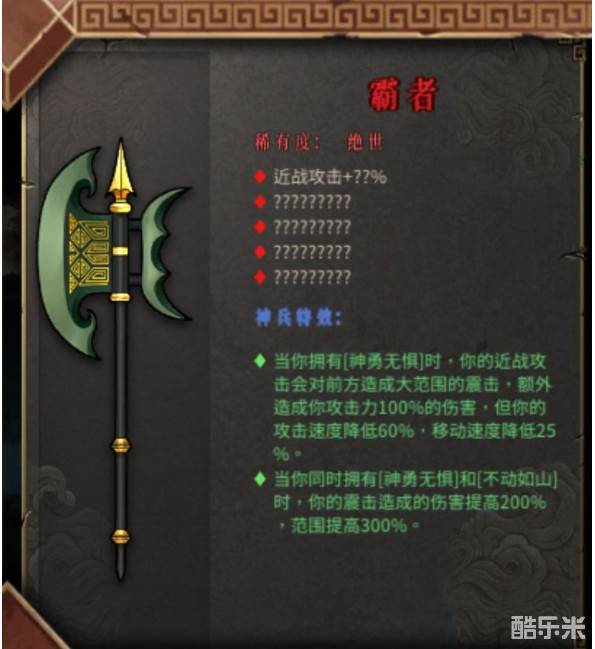 当你同时拥有神勇无惧,不动如山时,配合冷血,虎王,你将拥有一击致命的能力。