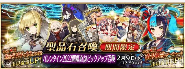 开启花嫁、BX、女帝、紫式部和清少纳言的卡池,卡池也有各从者对应情人节的限定礼装UP。