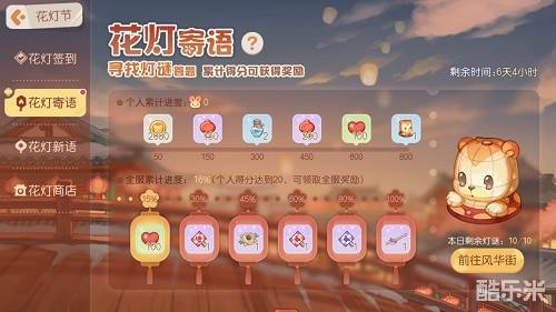 个人累计进度达到800,即可领取精美主题家具「花灯照影」、爱心、花灯等好礼;全服累计进度达到100%,即可获得高级宠物笛、晶钻服装彩蛋锤、爱心服装彩蛋锤等奖励。
