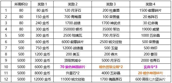 达到12000金币即可获得12紫色防御二阶宝物+8紫色攻击二阶宝物+8紫色兵力二阶宝物