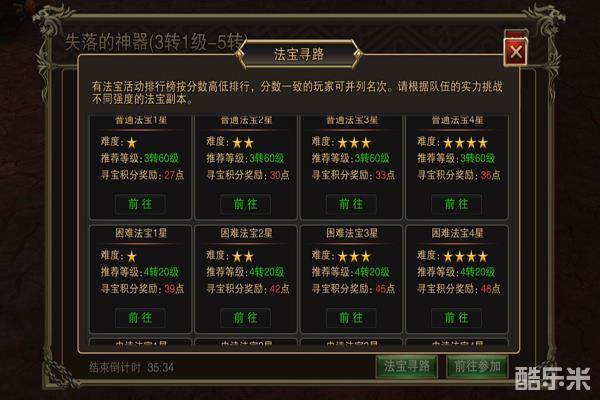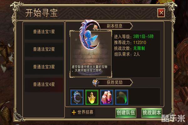 2.至少2人组队参加,根据队伍实力,选择挑战不同强度的法宝副本。