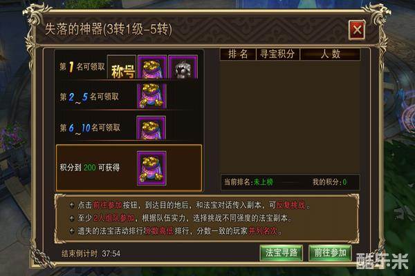 3.遗失的法宝活动排行榜根据分数高低排行,分数一直的玩家并列名次。