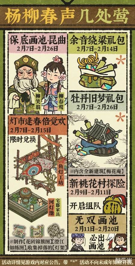 【灯市逢春倍觉欢】限时兑换活动开启!收集林场和竹林生产掉落的【灯架】,制作【花团锦簇图】【澄江如练图】,搭配其他材料可兑换建筑【鱼灯工坊】以及全新家具【河灯池】,过一个热热闹闹的元宵佳节。