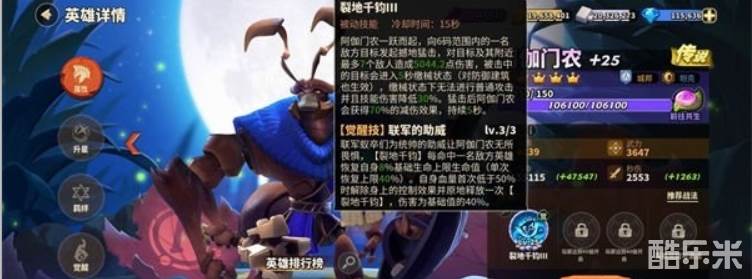 联军蚁卒们为统帅的助威让阿伽门]农无所畏惧,[裂地千钧] 每命中一名敌方英雄恢复自身8%基础生命上限生命值(单次恢复上限40%)。自身血量首次低于50%511时解除身上的控制效果并原地释放一次[裂地千钧],伤害为基础值的40%。