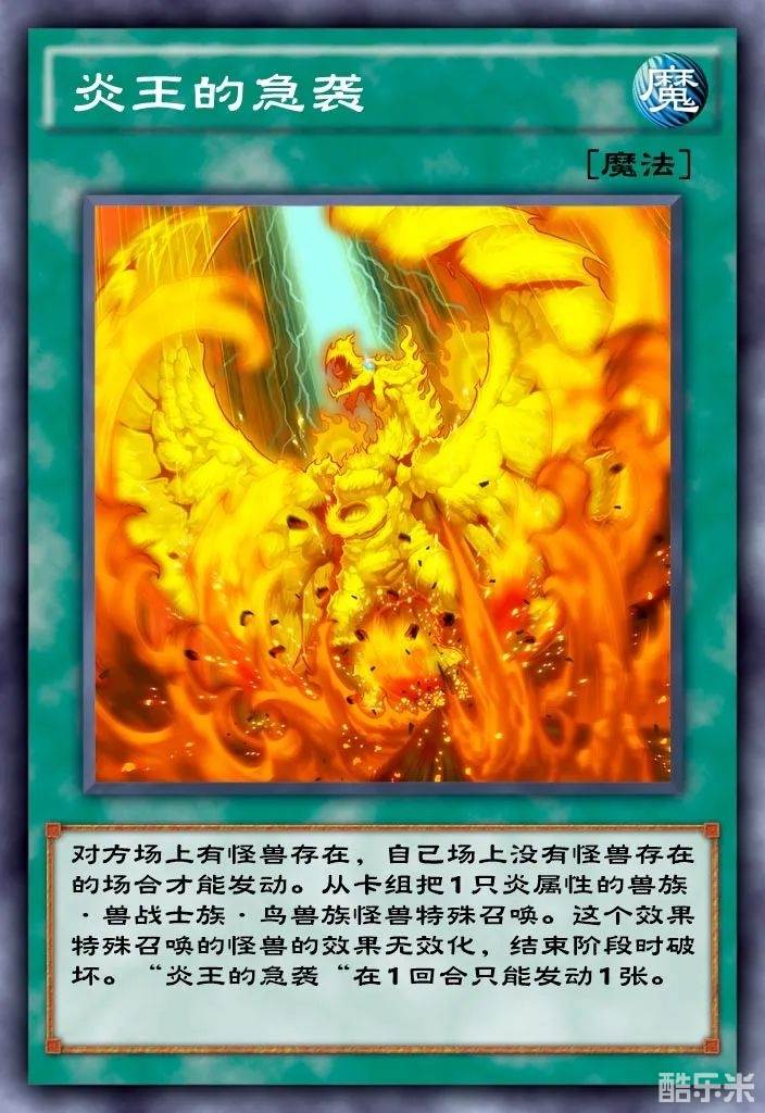对方场上存有怪兽,自己场上没有怪兽的场合才能发动。从卡组把1只炎属性的兽族·兽战士族·鸟兽族怪兽特殊召唤。