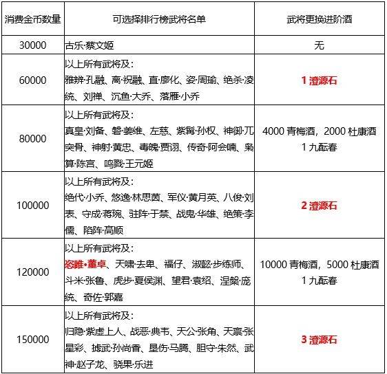 1、活动期间,累计消费金币数量达到对应金额,可以联系在线客服申请1个排行榜武将奖励,或对应金额的进阶酒或澄源石奖励;